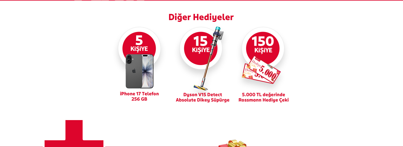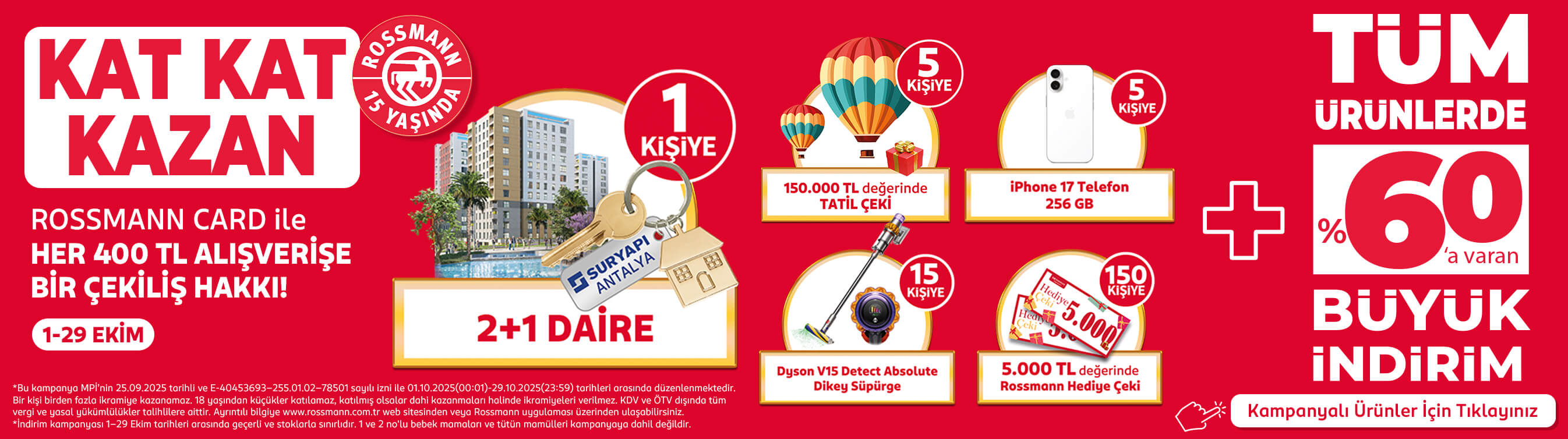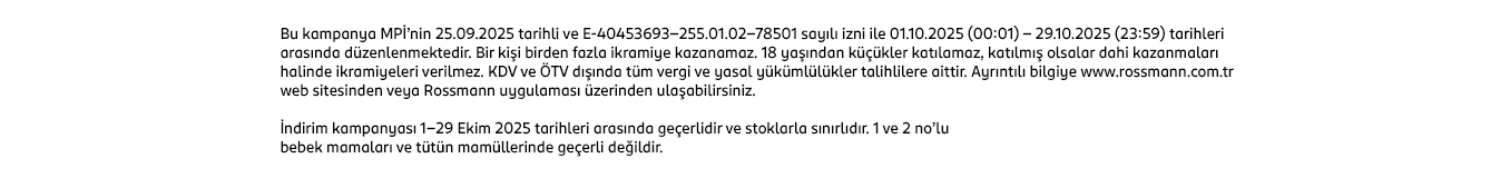 Bu kampanya MPİ'nin 25.09.2025 tarihli ve E-40453693-255.01.02-78501 sayılı izni ile 01.10.2025 (00:01) - 29.10.2025 (23:59) tarihleri arasında düzenlenmektedir. Bir kişi birden fazla ikramiye kazanamaz. 18 yaşından küçükler katılamaz, katılmış olsalar dahi kazanmaları halinde ikramiyeleri verilmez. KDV ve ÖTV dışında tüm vergi ve yasal yükümlülükler talihlilere aittir. Ayrıntılı bilgiye www.rossmann.com.tr web sitesinden veya Rossmann uygulaması üzerinden ulaşabilirsiniz.
