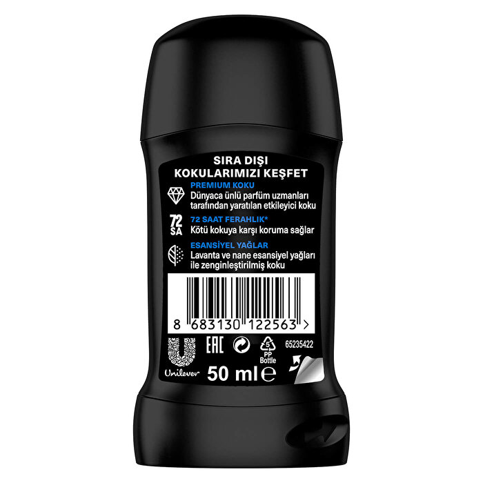 AXE Premium Collection Blue Lavender Stick, 50 ml boyutunda, siyah gövdeye sahip ve mor detaylarla tasarlanmış şık stick formda ambalajda sunulmaktadır.