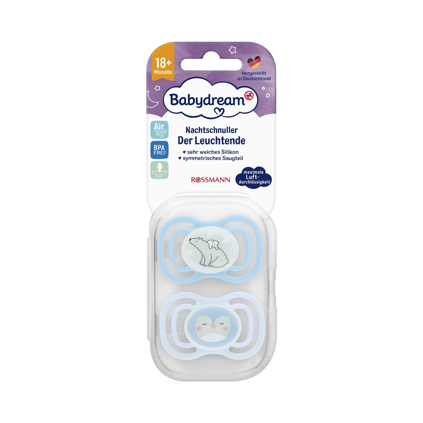 Simetrik emzik, doğal emme refleksini karşılar ve çene gelişimini destekler. Ekstra geniş açıklıklar sayesinde maksimum hava geçirgenliği sağlar. 180° döndürülebilir. Daha yoğun bir parlaklık etkisi için emziği kısa süreliğine gün ışığına veya lambanın altına yerleştirin (doğrudan güneş ışığından kaçının). Hijyenik mikrodalga hazırlığı için sterilizasyon kutusu dahildir.