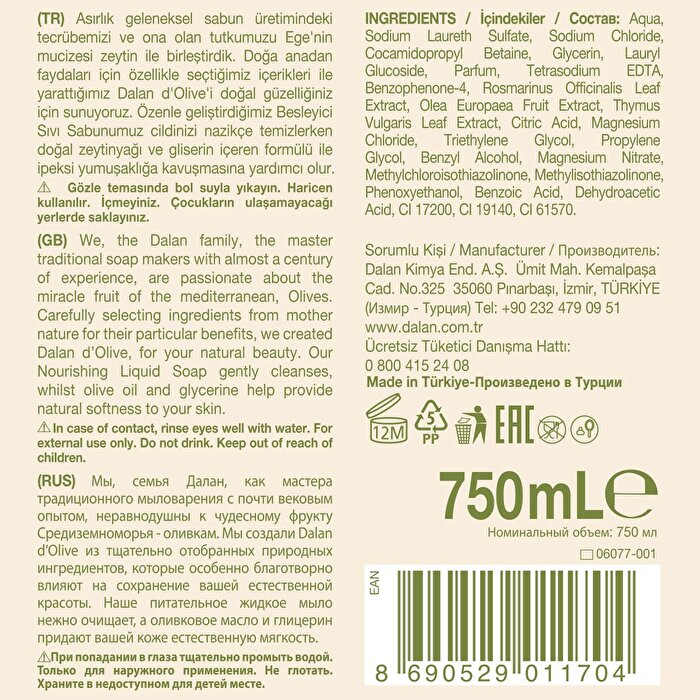 Asırlık geleneksel sabun üretimindeki tecrübemizi ve ona olan tutkumuzu Ege’nin mucizesi zeytin ile birleştirdik. Doğa anadan faydaları için özellikle seçtiğimiz içerikleriyle yarattığımız Dalan d’Olive’i doğal güzelliğiniz için sunuyoruz. Özenle geliştirdiğimiz Besleyici Sıvı Sabunumuz, cildinizi nazikçe temizlerken doğal zeytinyağı ve gliserin içeren formülü ile ipeksi yumuşaklığa kavuşmasına yardımcı olur.