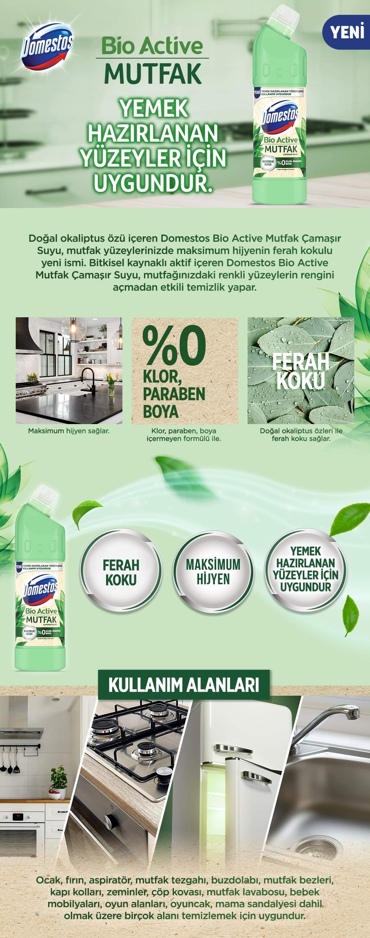 Doğal okaliptus özü içeren Domestos Bio Active Mutfak Çamaşır Suyu, Domestos’un mutfak yüzeylerine özel olarak geliştirdiği çamaşır suyudur. Mutfak yüzeylerinizde maksimum hijyenin ferah kokulu yeni üyesi Domestos Bio Active Mutfak Çamaşır Suyu, yemek hazırlanan yüzeylerde kullanıma uygundur. Bitkisel kaynaklı aktif içeren Domestos Bio Active Mutfak Çamaşır Suyu’nın formülü klor, paraben ve boya içermez. Mutfağınızdaki renkli yüzeylerin rengini açmadan etkili temizlik yapar.