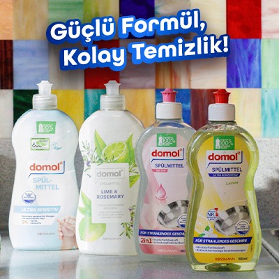Domol bulaşık ürünleri, inatçı kirlerle savaşırken hassas ciltlere özen gösterir. Hem hijyenik hem pratik çözümler bir arada.