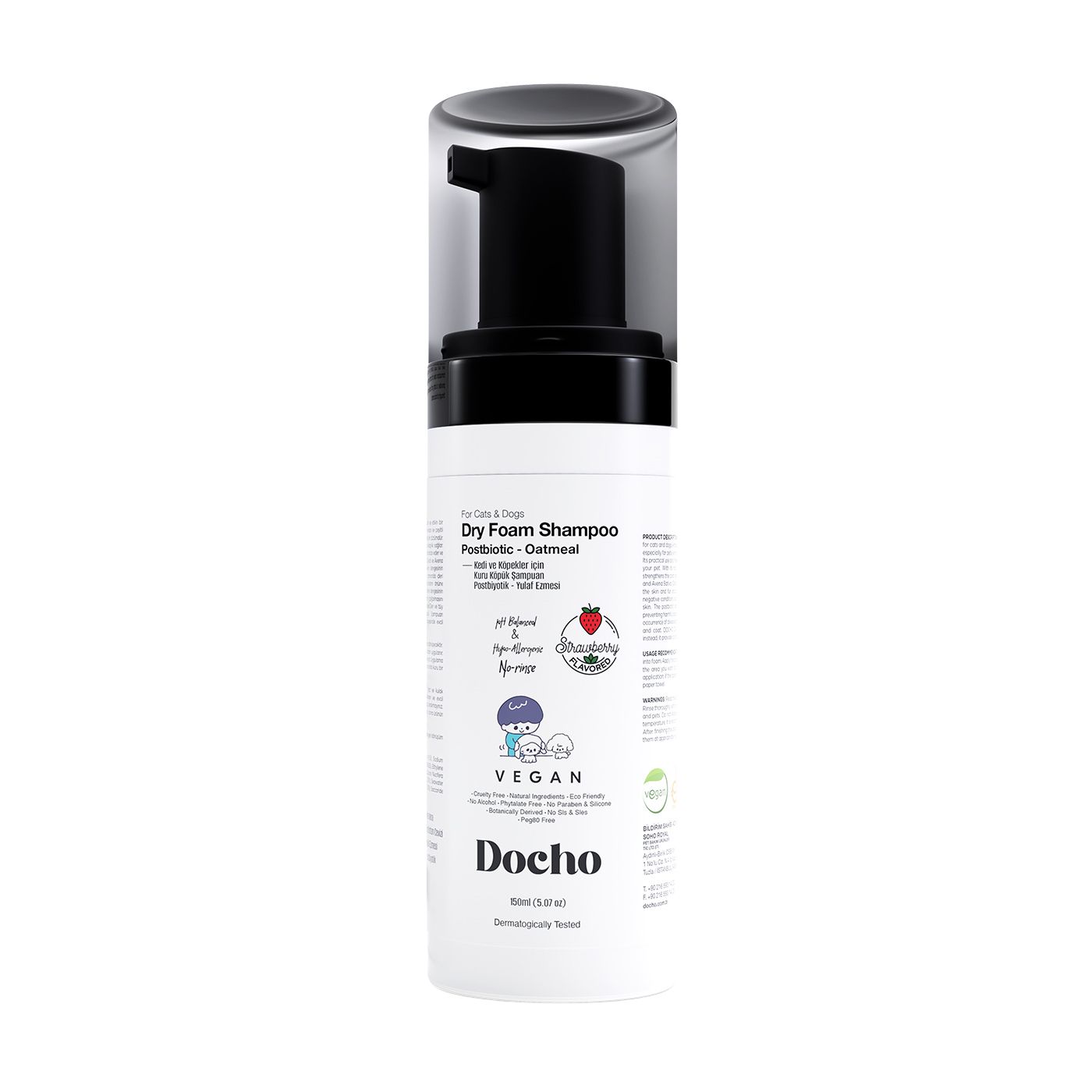 Docho Kedi ve Köpek Kuru Köpük Şampuanı - Postbiyotik, aloe vera, hindistan cevizi, yulaf ezmesi, postbiyotik, vitamin E ve B5 içerir. Vegan ve bitkisel içerikli olup, dermatolojik olarak test edilmiştir.