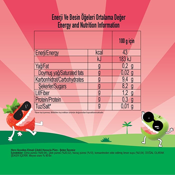 Çocuklar için atıştırmalığın tanımını değiştiriyoruz! Hero Goodies İçilebilir Meyve Püreleri çocuklar için sağlıklı ve bir o kadar da eğlenceli oyun arkadaşı olmaya geliyor! Şeker ilavesiz, 100% MEYVE VE SEBZE'den oluşan içerikleriyle koruyucu içermez, Lif kaynağıdır.