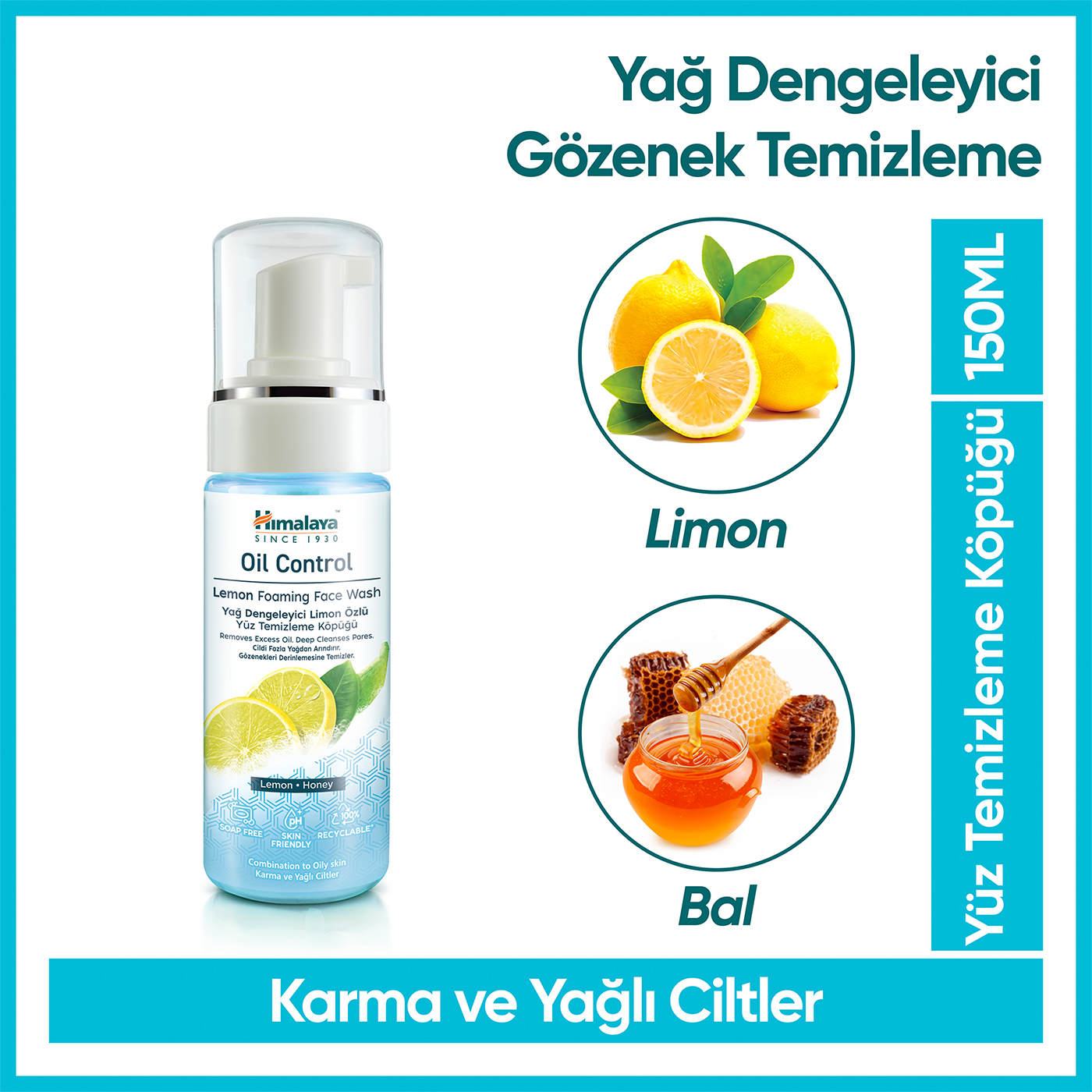 Himalaya Limon Özlü Yüz Temizleme Köpüğü Yağ Dengeleyici 150 ml günlük kullanıma uygun, sabun içermeyen bir yüz temizleyicidir. Ciltteki fazla yağların ve kirlerin temizlenmesi için bal ve eşsiz limon özleri ile özel olarak formüle edilmiştir. Formülündeki özel bileşenleri sayesinde ciltteki siyah noktaların azalmasına katkıda bulunur. Doğal sıkılaştırıcı özelliği ile ön plana çıkan limon içeren formülü, cildi sıkılaştırma etkisinin yanı sıra ciltteki parlaklığı giderir ve cilde gözle görünür bir matlık kazandırır. Bal ise cildi kurutmadan ve gerginlik hissine neden olmadan cildi yumuşatarak ferahlık kazandırır.
