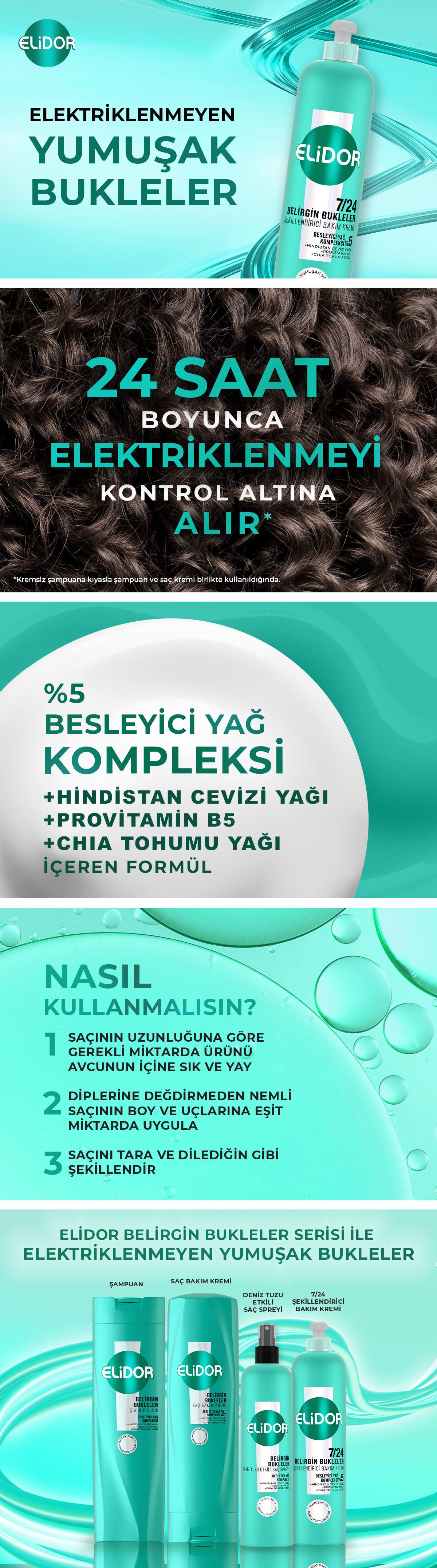 Kıvırcık ve dalgalı saçlara özel olarak geliştirilen Elidor Belirgin Bukleler 7/24 Şekillendirici Bakım Kremi, buklelerin doğal güzelliğini ortaya çıkarırken aynı zamanda saç bakımını da pratik hale getirir. Durulama gerektirmeyen formülü sayesinde günün her anında rahatlıkla kullanılabilir. Saç uzunluğuna göre avuç içine alınan uygun miktardaki ürün, nemli saçın boy ve uçlarına eşit şekilde uygulandığında, bukleler belirginleşir ve saç daha kolay şekil alır. Ürünün formülünde yer alan Hindistan Cevizi yağı, Provitamin B5 ve Chia Tohumu yağı, saçın ihtiyaç duyduğu nemi sağlar, elastikiyetini destekler. Saça derinlemesine bakım yapar ve 2 kat* daha yumuşak ve parlak bukleler kazandırır. Saçınızı özgürce şekillendirmeniz için ısıya karşı koruma özelliği ile geliştirilmiştir. Elidor Belirgin Bukleler 7/24 Şekillendirici Bakım Kremi, elektriklenmeyi 72 saate kadar kontrol altına alır buklelerinizi belirginleştirir. Özellikle kıvırcık ya da dalgalı saç tipine sahip kişiler için uygun olan ürün, saçın elektriklenmesini önlerken buklelerin daha pürüzsüz ve canlı görünmesini sağlar. Kullanım sonrasında saçları ağırlaştırmadan doğal bir parlaklık kazanır. Pratik ambalajıyla günlük saç bakım rutininin ayrılmaz bir parçası olan Belirgin Bukleler 7/24 Şekillendirici Bakım Kremi, özellikle yoğun yaşam temposunda hızlı ve etkili çözümler arayanlar için idealdir. Elidor’un uzman formülüyle geliştirilen ve durulama gerektirmeyen Belirgin Bukleler 7/24 Şekillendirici Bakım Kremi, buklelerin her zaman en iyi halini ortaya çıkarmayı hedefler.