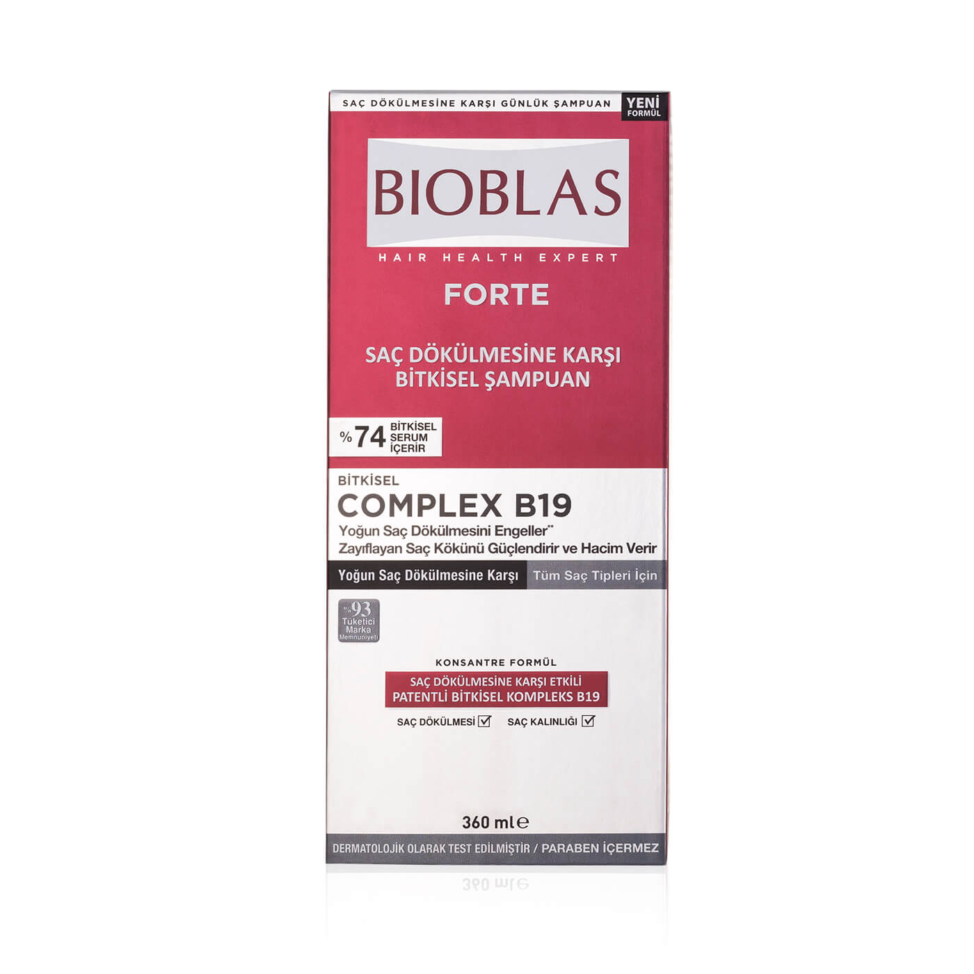 Bioblas Forte şampuan, yoğun içeriği sayesinde saç ve saçlı deriyi besleyip saçların daha canlı, güçlü ve sağlıklı olmasını sağlar. %74 bitkisel içeriği ile yoğun saç dökülmelerine karşı etkilidir. Saç köklerini besler ve saçların uzamasına ve güçlenmesine yardımcı olur. Günlük kullanıma uygundur.Yoğun saç dökülmesine karşı etkilidir.