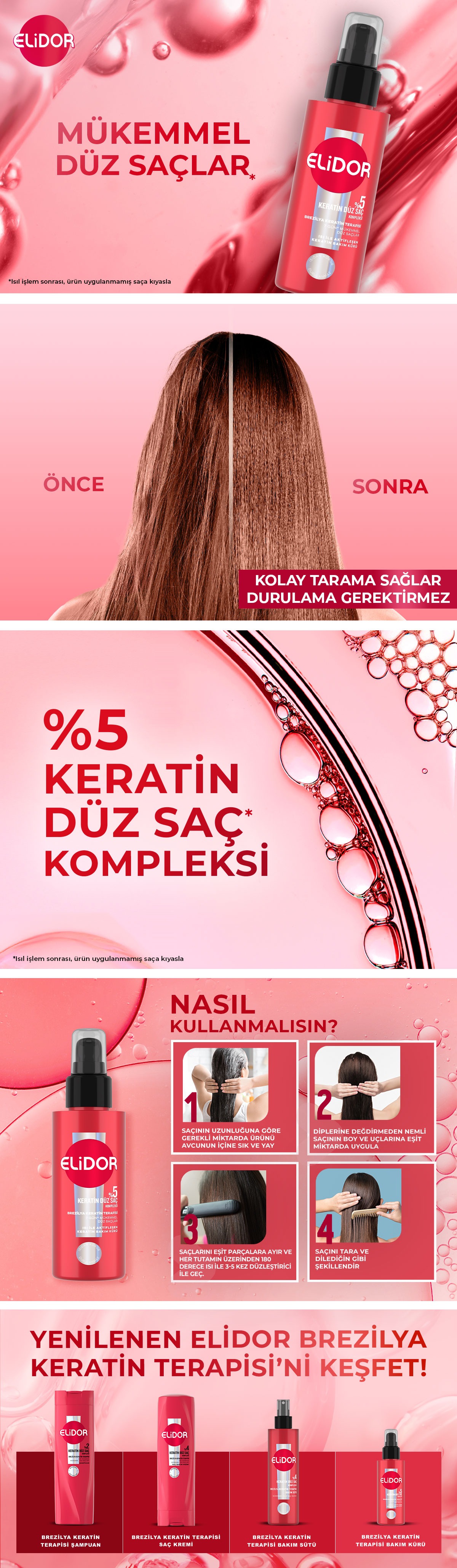 Türkiye’nin 1 numaralı* saç bakım markası Elidor yenilendi! Elidor Brezilya Keratin Terapisi Keratin Bakım Kürü, %5 Keratin Düz Saç Kompleksi ile zenginleştirildi. Serinin tamamıyla birlikte kullanıldığında, 7 gün* boyunca mükemmel düz saçlar sağlar. Elidor Brezilya Keratin Terapisi Keratin Bakım Kürü ile elektriklenmeye son, ısı hasarına karşı koruma, üstelik ekstra bakım da yanında! Isıyla şekillendirme saçlarına hasar verebilir, ama bu ürünle saçlarını hasar vermeden düzleştirmen mümkün. Saçını ağırlaştırmadan, mükemmel bir düzlük ve sağlıklı bir görünüm sunar. Her uygulamada saçlarının daha parlak, daha canlı ve daha pürüzsüz göründüğünü fark edeceksin. Nasıl kullanmalısın? Saçlarını Elidor Brezilya Keratin Terapisi serisinden şampuanı ve saç kremiyle yıka. Ardından saçını havluyla kurula ve 4-5 eşit parçaya ayır. Her bir tutam için 2-3 pompa ürünü, saç diplerinden kaçınarak uygula. Saçlarını tara ve tamamen kurut. Son olarak saçını yine eşit parçalara ayırarak her tutamın üzerinden düzleştiriciyle 3-5 kez geç. Elidor Brezilya Keratin Terapisi Keratin Bakım Kürü ısı ile aktifleşir! Bu kadar basit!