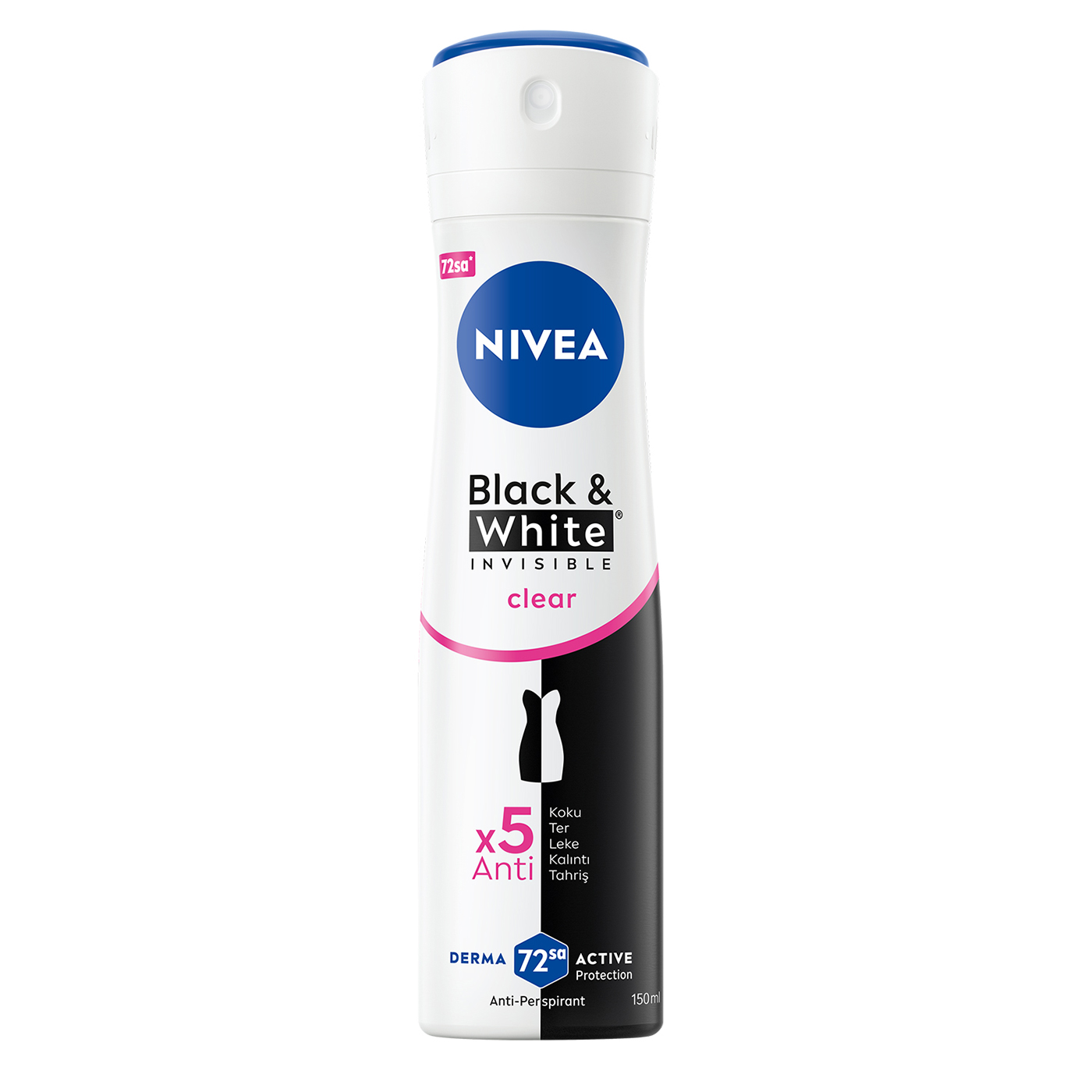 NIVEA Kadın Sprey Deodorant Black&White Clear, koyu renkli giysilerde beyaz iz, açık renkli giysilerde ise sarı leke karşıtıdır.