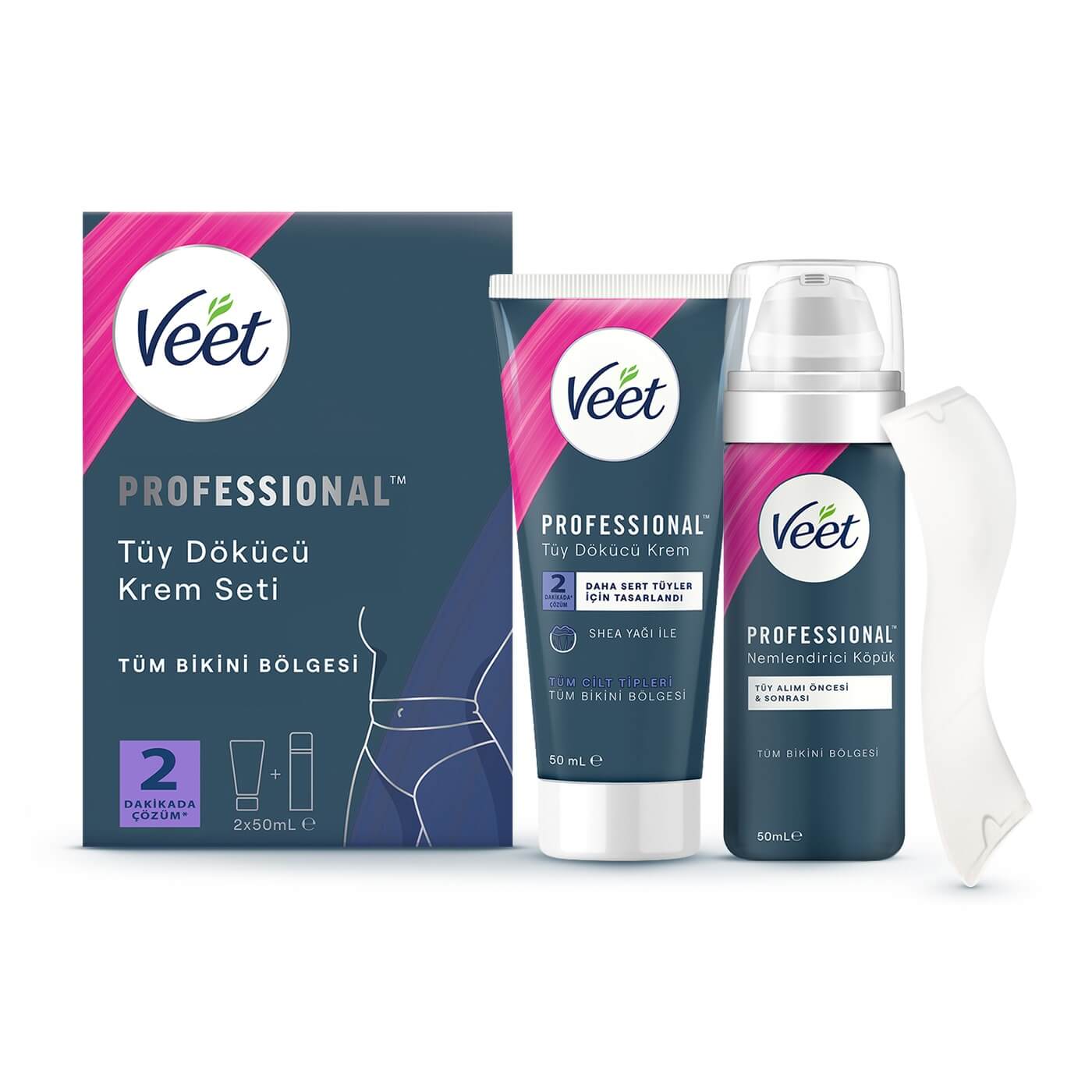 Veet Professional Tüm Bikini Bölgesi için Tüy Dökücü Krem Seti, kasık bölgesinde kullanım için klinik olarak kanıtlanmıştır. Hassas ciltler dahil tüm cilt tipleri için uygundur. Daha sert tüyler için tasarlanan tüy dökücü krem, 2 dakikada çözüm sağlar*. -Tüy Dökücü Krem: Shea yağı ile formüle edilmiş ve ciltte doğal olarak bulunan bir nemlendirici ile zenginleştirilmiştir. Daha sert tüyleri almak için tasarlanmıştır, 2 dakikadan itibaren etkilidir ve 48 saat boyunca cildi nemli tutar. - Nemlendirici Köpük: Hafif dokuludur, cildi nazikçe peeling etkisi yapar ve nemlendirir. Tüy alımı öncesinde, sonrasında ve seans aralarında kullanılabilir. *2 dakikadan itibaren etkilidir. DERMATOLOJİK OLARAK TEST EDİLMİŞTİR. Bu paket: - Tüy Dökücü Krem - Nemlendirici Köpük - Spatula içerir