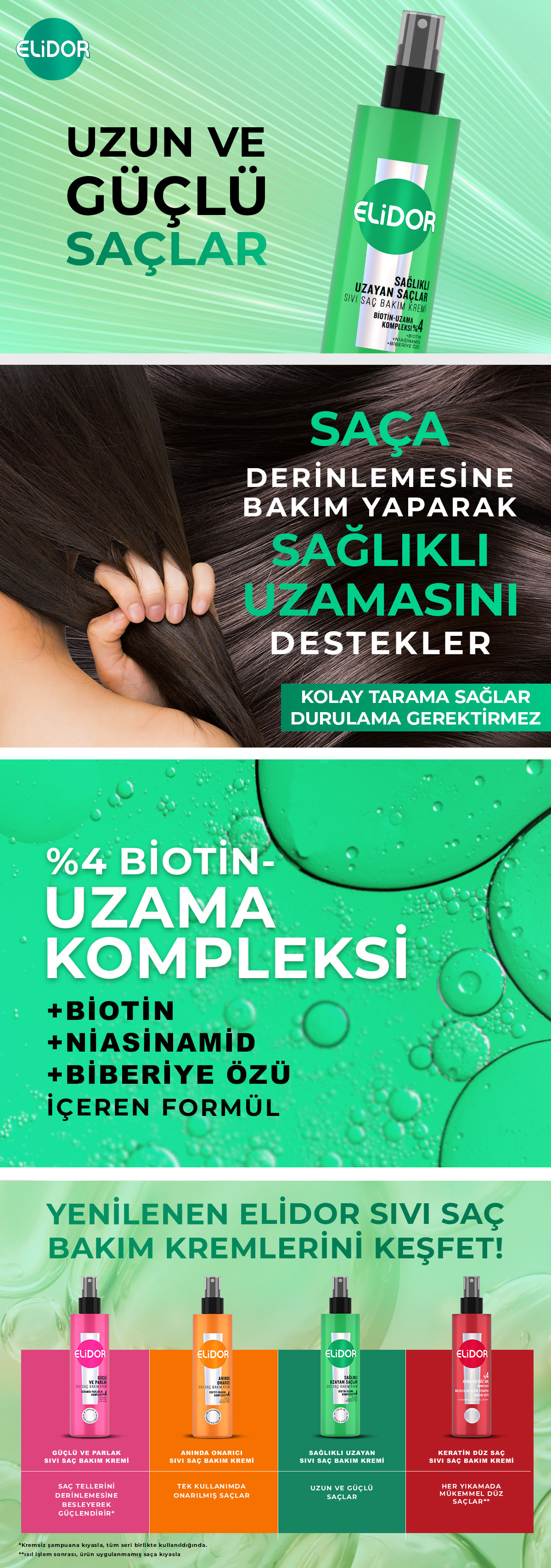 Türkiye’nin 1 numaralı* saç bakım markası Elidor yenilendi! Elidor Sağlıklı Uzayan Saçlar Sıvı Saç Bakım Kremi, %3 Biotin-Uzama Kompleksi ile saçlarının sağlıklı ve güçlü uzamasına destek olur. Biotin, Niasinamid ve Biberiye özü içeren özel formülü sayesinde saçlarına derinlemesine bakım yapar, onları güçlendirir ve kırık saç uçlarının oluşmasını engeller. Kremsiz şampuanlara kıyasla saç kırıklarını belirgin şekilde azaltmasıyla**, saçlarını daha uzun süre sağlıklı tutmana yardımcı olur. Elidor Sağlıklı Uzayan Saçlar Sıvı Saç Bakım Kremi’nin en güzel yanı durulama gerektirmemesi! Saçına nemliyken veya kuru halde kolayca uygulayabilir, diplerine değdirmeden sürüp hemen tarayabilir, dilediğin gibi şekillendirebilirsin. Böylece saç bakım rutinin hızlanır, zahmetsizce sağlıklı ve canlı saçlara sahip olursun. Formülünde bulunan Biotin, saç köklerini besleyen bir içeriktir. Formülündeki Niasinamid ise saç derisi sağlığına sağladığı fayda ile bilinir. Biberiye özü ise saçların daha güçlü ve dayanıklı olmasını sağlar. Tüm bu bileşenler bir araya gelerek, saçlarının sağlıklı uzamasını destekler.