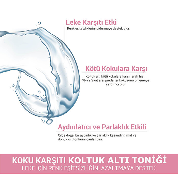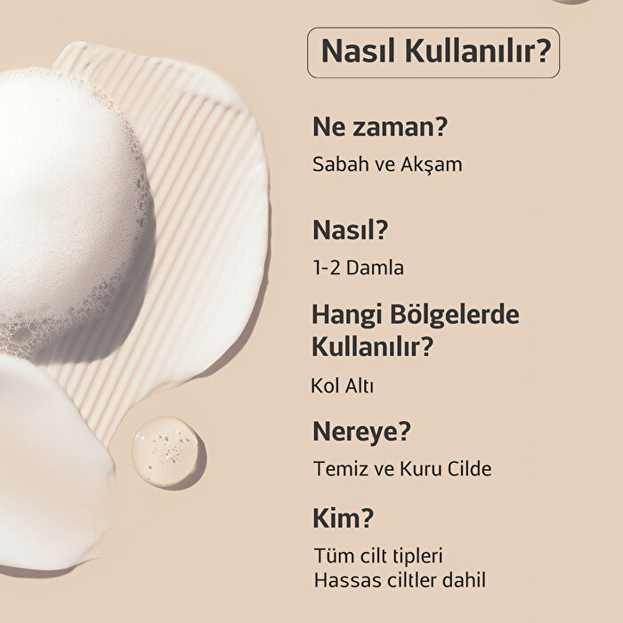 Kullanım Talimatları: Cilt temizliğinin ardından, pamuk yardımıyla koltuk altına uygulayınız. Kullanım sonrası durulama gerektirmez.