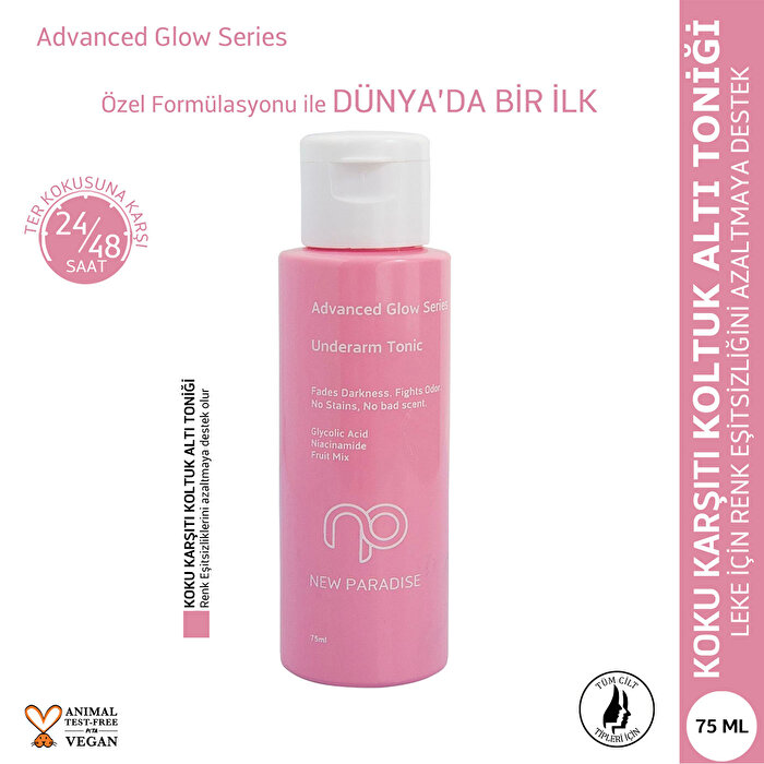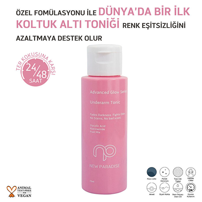 Koltuk altı bakımında yeni bir dönem başlatan NEW PARADISE Koltuk Altı Toniği, özel formülüyle hem ter kokusuna hem de renk eşitsizliklerine karşı etkili bir çözüm sunar. Cilt tonunu eşitlemeye yardımcı olan bu yenilikçi tonik, koyu lekeleri hedef alır, cildi aydınlatır ve 48 ila 72 saat boyunca ferahlık hissi sağlar.