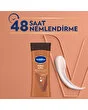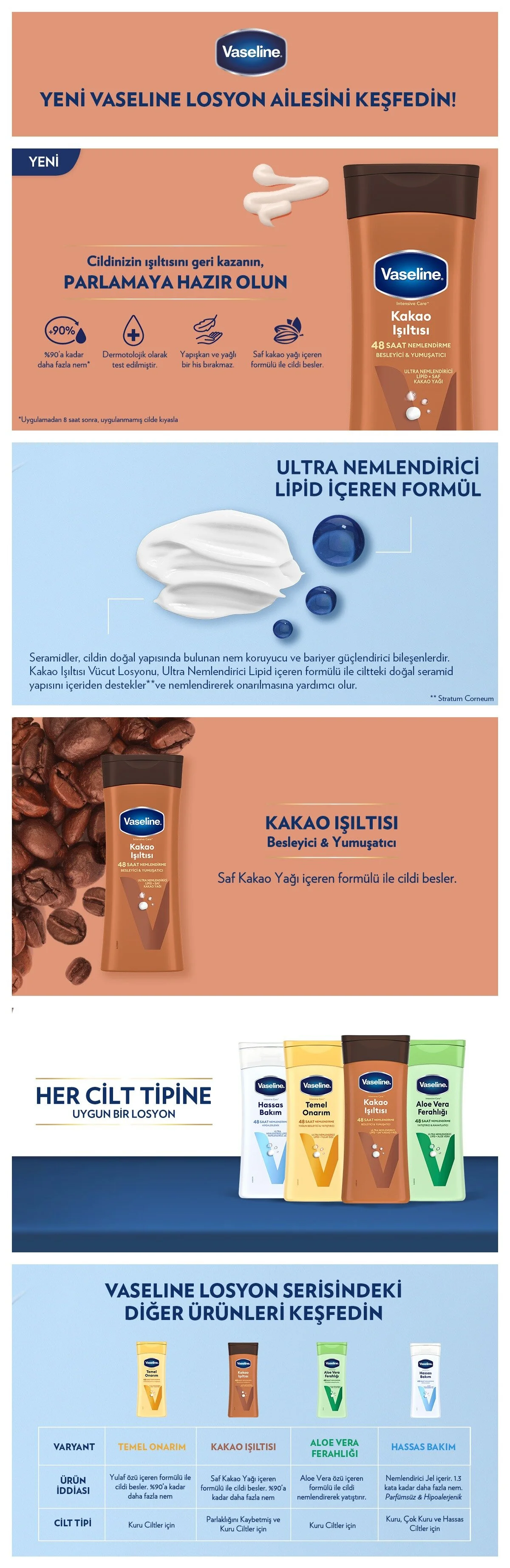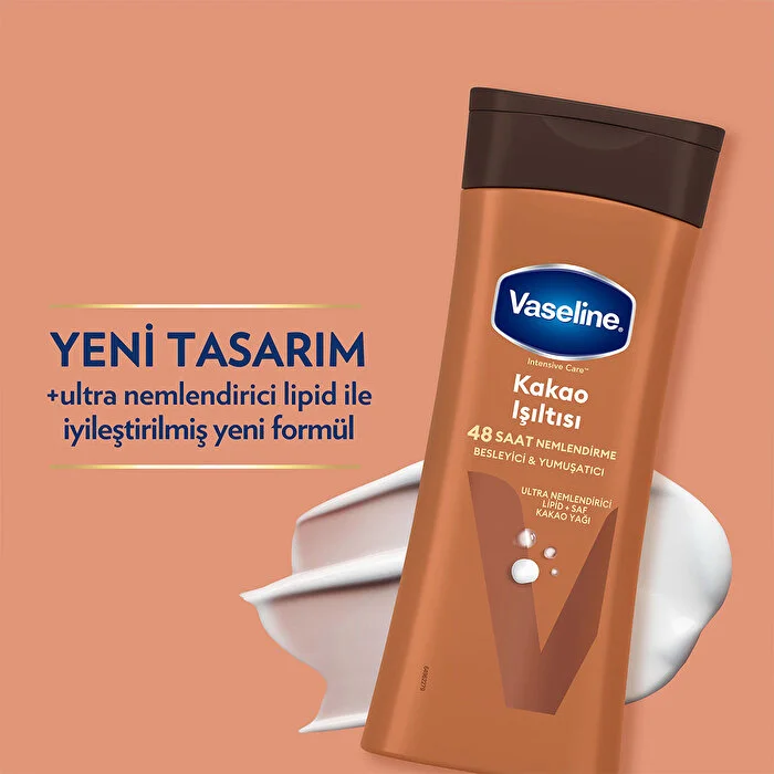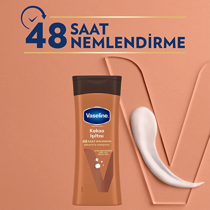 Vaseline Kakao Işıltısı Vücut Losyonu ile tanışmaya hazır mısınız? Adıyla bütünleşmiş bu muhteşem losyon, Ultra Nemlendirici Lipid içeren formülü ile cildinizi 48 boyunca nemlendirirken, saf kakao yağı ile cildinizi besler ve ipeksi bir yumuşaklık sağlar. Seramidler, cildin doğal yapısında bulunan nem koruyucu ve bariyer güçlendirici bileşenlerdir. Kakao Işıltısı Vücut Losyonu, Ultra Nemlendirici Lipid içeren formülü ile ciltteki doğal seramid yapısını içeriden* destekler ve nemlendirerek onarılmasına yardımcı olur. Vaseline Kakao Işıltısı Vücut Losyonu %90’a kadar** daha fazla nem sağlarken cildinizi nemlendirerek onarır. Vaseline Kakao Işıltısı Vücut Losyonu, uygulandığı bölgede hemen emilerek yağlı ve yapışkan bir his bırakmaz. Kullandığınız andan itibaren cildinizi nemlendirir, böylece cildiniz her zaman bakımlı, yumuşak ve ışıl ışıl kalır. Düzenli kullanımda cildinizin daha esnek ve parlak olmasına yardımcı olur. Güzellik ve bakım rutininizin vazgeçilmez bir parçası haline gelecek olan Vaseline Kakao Işıltısı Vücut Losyonu, cildinizin ihtiyaç duyduğu bakımı sağlayarak ona hak ettiği özeni gösterir.